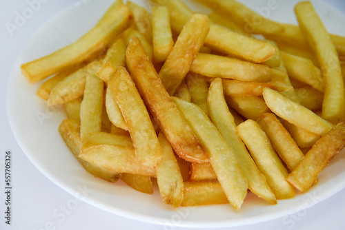 Yellow delicious French fries in white dishes. Fast food on a plate. Fried potatoes. Toasted potato slices on a white background.