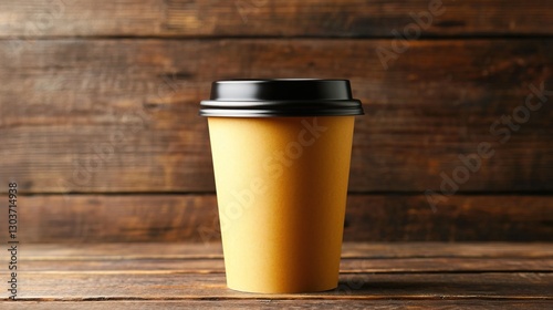 Yellow Disposable Coffee Cup on Wooden Surface for Café Usage