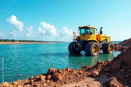 Yellow dredge in the foreground with estuary landscape, dock, blue