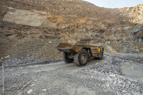 Yellow dump truck Atlas Copco Minetruck in open pit quarry mine