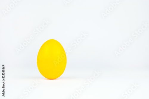 Yellow easter egg isolated on white background. Chicken egg painted in yellow color stands on surface, close up. Object for design to easter holiday