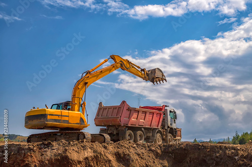 Yellow excavator and empty dump truck working at the construction site