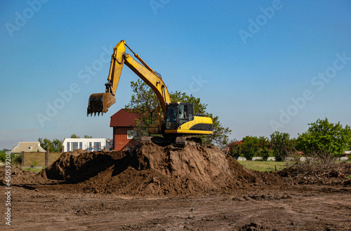 Yellow excavator on a mountain of bright brown earth, construction work