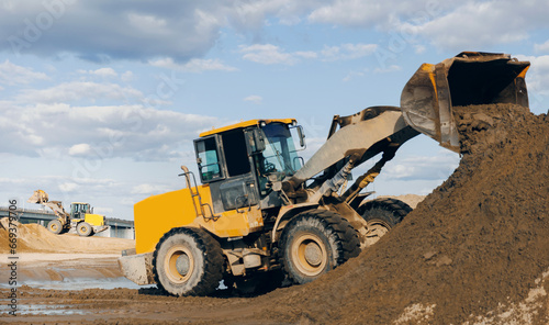Yellow Excavator working on sand industrial quarry. Construction site industry concept