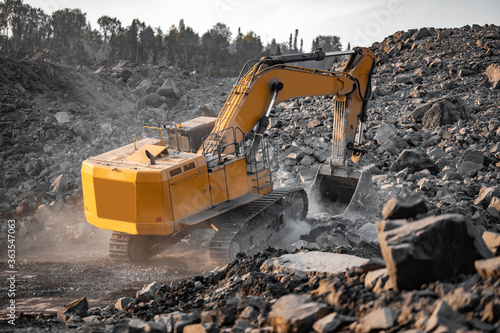 Yellow excavator works and extracts coal from bowels of earth. Open pit mine industry
