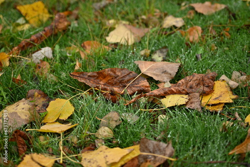yellow fallen leaves of poplar, yellow brown leaves on a green background