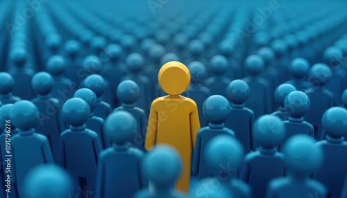 Yellow figure stands out in blue crowd. Illustrates finding unique talent. Image talent acquisition, employee selection. Vivid visual for HR, recruitment. Distinct individual in team environment.
