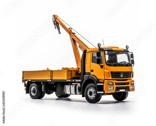 Yellow flatbed truck with crane arm. Car manipulator isolated on a white background