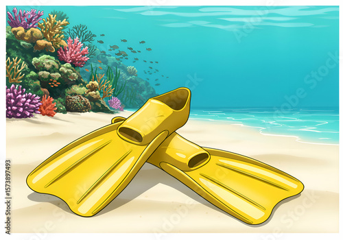 Yellow flippers rest on a sandy beach in an underwater scene. Relaxed aquatic gear for a day of diving or snorkeling in a coral reef environment.