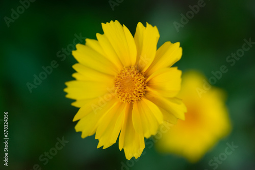 Yellow flower with yellow center. Yellow coreopsis with selective focus and bokeh. tickseed