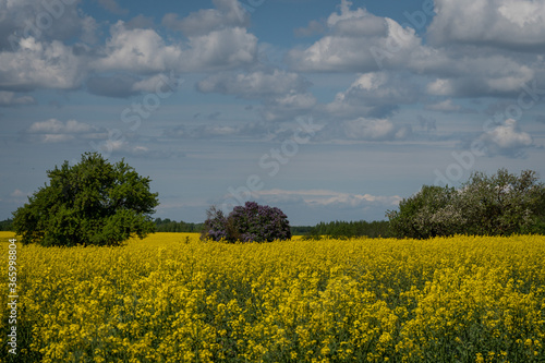 Yellow flowers and blue sky with clouds.. Blooming rapeseed field on a bright sunny day