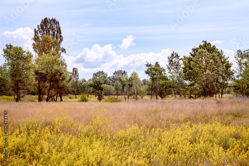 Yellow Galium verum flowers, also known as lady's bedstraw or yellow bedstraw, in the Meadow at the edge of the forest, at the end of spring in Kiev, Ukraine