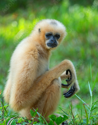 Yellow gibbon Nomascus gabriellae sits on the grass and looks at the camera in close-up