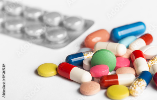 Yellow, green, blue and white medical tablets. Tablets in plastic packaging.