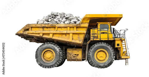 "Yellow heavy construction machinery including bulldozer, excavator, loader, and dump truck, working on a construction or mining site. Industrial vehicles with large wheels, transporting earth and bui