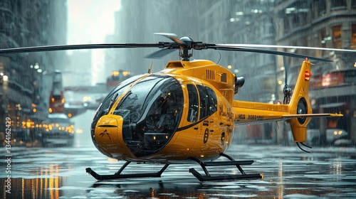 Yellow helicopter landing on a rainy urban street with reflections and blurred cityscape