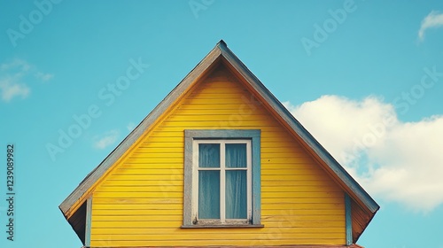 Yellow house peak with white window and blue trim against a bright sky with soft clouds