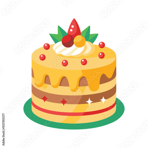 Yellow layered cake decorated with strawberries lemon and red berries vector illustration isolated on white background