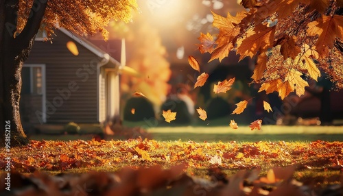 yellow leaves fell on the ground against the background of the house, autumn concept.