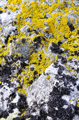 Yellow lichen of the genus Candellaria growing on a stone