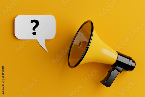 Yellow Megaphone with Question Mark on a Speech Clouds Chat Bubble. 3d Rendering