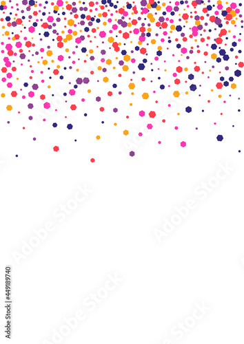 Yellow New Confetti Background. Circle Dust Texture. Purple Dot Fall. Round Multicolor Carnival Frame. Random Illustration.