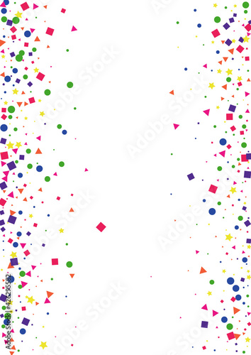 Yellow Rainbow Confetti Decoration. Party Circle Illustration. Pink Square Background. Red Shiny Dot.