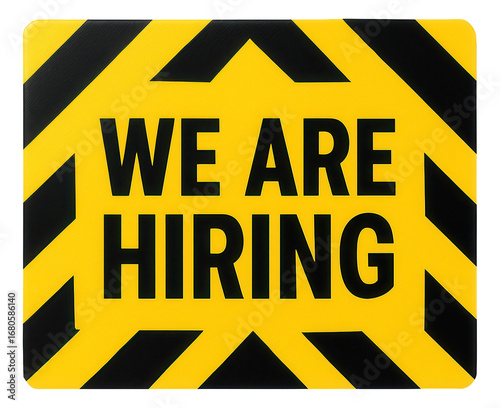 Yellow rectangular sticker with WE ARE HIRING message in bold lettering, eye-catching retail promotion offer on transparent background.