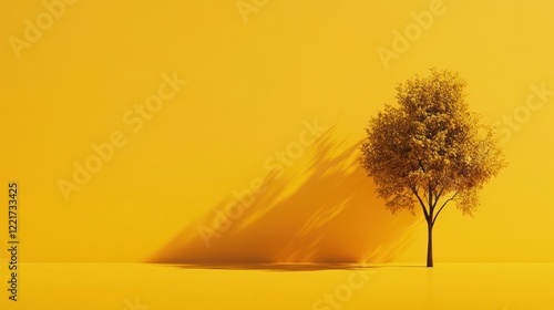 Yellow room, single tree, long shadow, minimalist design, backdrop