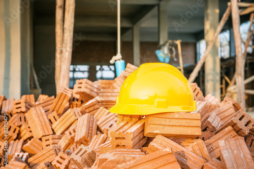 Yellow safety helmet or hard hat in construction site