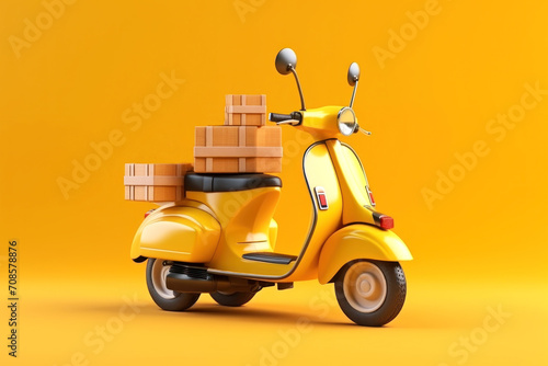 Yellow scooter with cardboard boxes. Stylish motorcycle for the delivery of products and goods. Generated by AI.