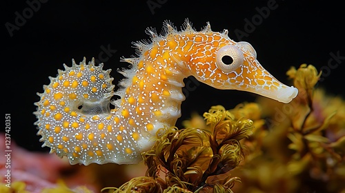Yellow seahorse in ocean coral reef, underwater wildlife.