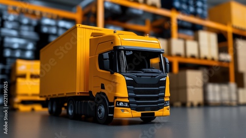Yellow Semi-Truck in Warehouse: A close-up of a vibrant yellow semi-truck parked inside a spacious warehouse, highlighting the efficient logistics and transportation industry.