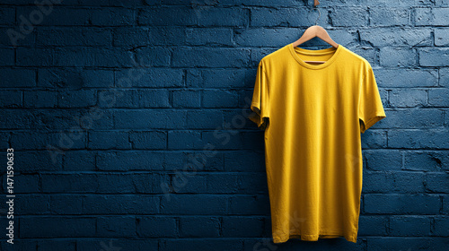 Yellow shirt on wooden hanger against blue brick wall, showcasing simple design ideal for apparel mockup or branding
