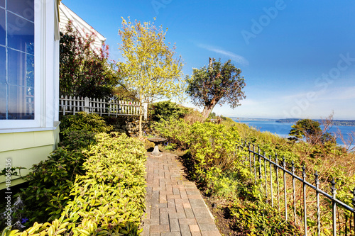 Yellow small home with water view and red maple.