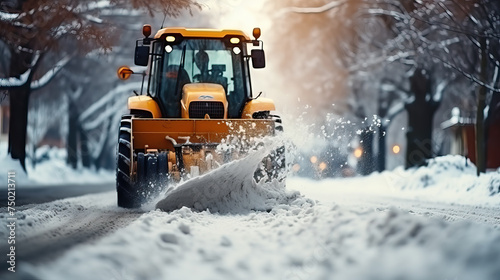 yellow snowplow, tractor, bulldozer, winter, road, snow, work transport, cleaning, city, snowdrifts, blizzard, cold, bucket, wheels, sweep, rake, machinery, trees, equipment