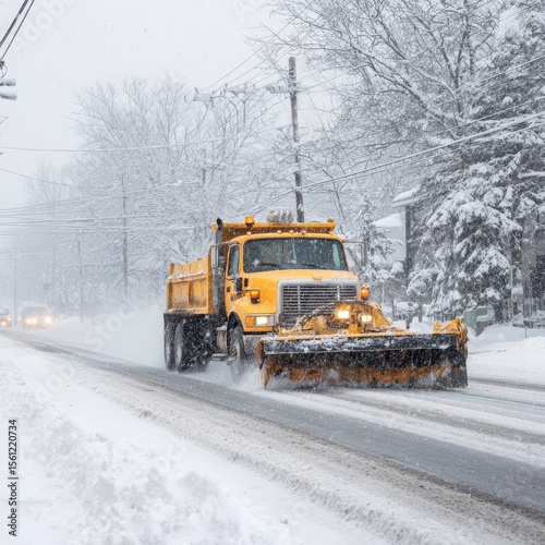 Yellow snowplow truck clearing a snow-covered residential street during a heavy blizzard