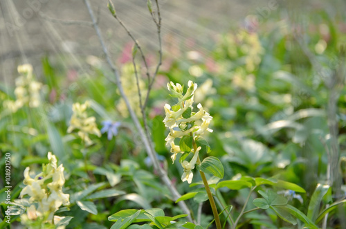 Yellow spring flowers in the grass in the sun rays