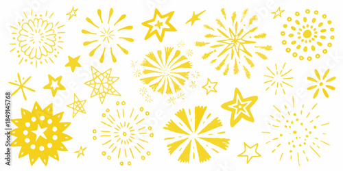 Yellow starbursts and sparkling shapes scattered on a clean white background