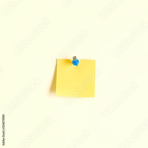 Yellow sticky note, blue pushpin, minimalist, clean background, office supplies, memo, reminder, simplicity, vibrant color contrast, square composition, close-up, crisp details, isolated object