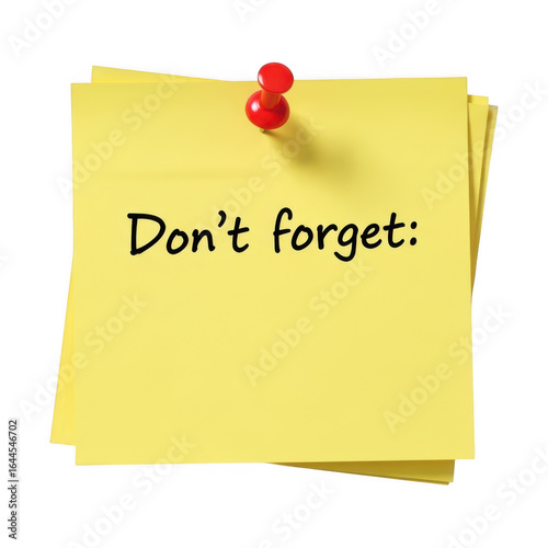 Yellow sticky note with red thumbtack and the words don t forget isolated on transparent background
