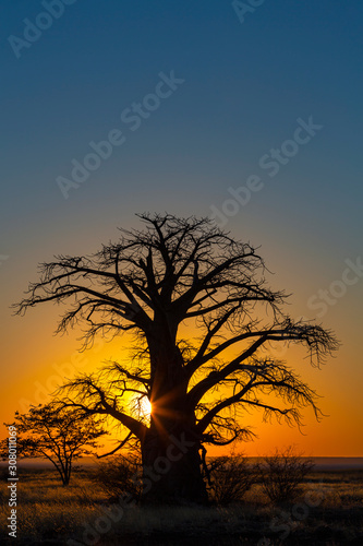 Yellow sunrise behind baobab tree on Kukonje Island