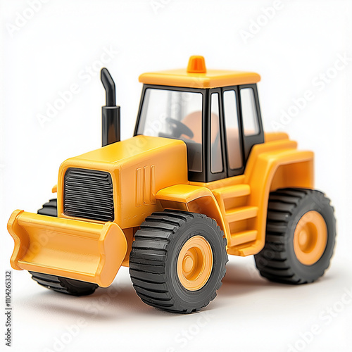 Yellow toy bulldozer, 3D plasticine icon, construction theme, isolated on white background