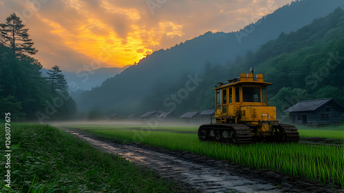 Yellow Tractor in Misty Rural Landscape at Sunrise