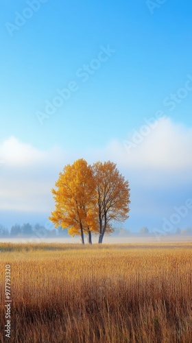 Yellow trees in autumn grassland under a clear blue sky at dawn