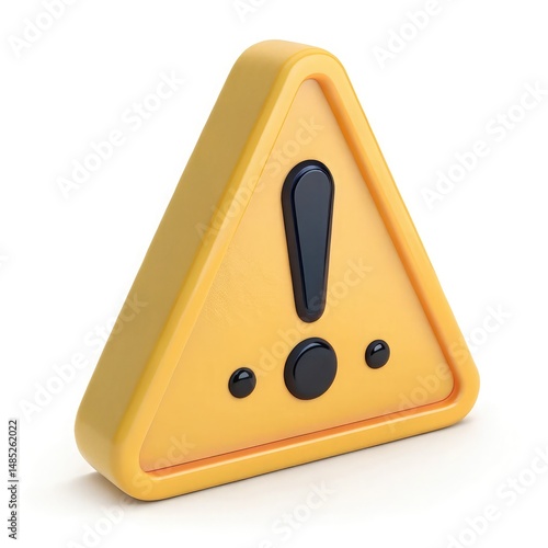 Yellow triangle warning icon with black exclamation mark, 3D cartoon plastic style, isolated