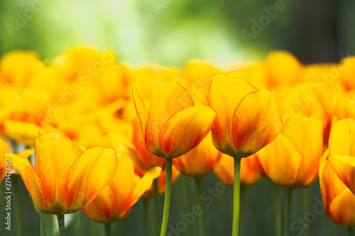 yellow tulip buds with fresh green leaves in soft light on blur background with place for your text. Holland tulip flowers in the park in spring.