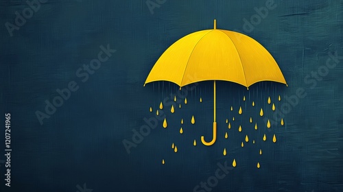 Yellow umbrella with raindrops falling from it is upside down. The raindrops are falling from the top of the umbrella, creating a sense of movement and fluidity