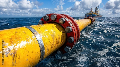 Yellow Underwater Pipeline with Red Flanges in Ocean