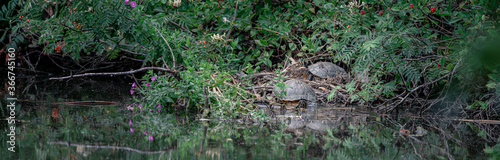 Yellow-bellied slider turtle, leaves its resting place and goes into the water, dumped animals, Amsterdam north, Baanakkerspark, Netherlands